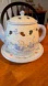 Wax melt simmer pot (vintage). Snow Folks teapot with matching plate. Uses candle tea lights and wax melts. Snowmen encircle the pot with mitten cutouts to let the fragrance escape. Teapot Measures approximately 6” high x 7” wide (spout to handle). Plate measures 7” circle. Perfect condition.