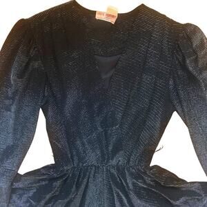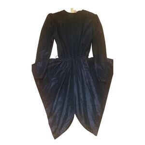 Stunning 1980s Wayne Diamond “Diamond’s Run” statement dress, made in the USA. Features dramatic puff sleeves, a deep V-neckline, elastic waist, and a metallic shimmer fabric with a tulip-style skirt hemline. Rare and collectible piece of authentic disco/80s glam fashion.