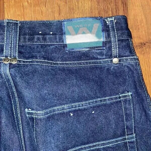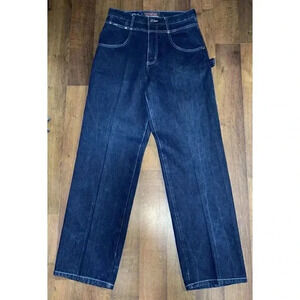 Elevate your denim game with these vintage Webs Original Jeanwear blue baggy jeans. The high-rise waist and straight leg style provide a comfortable fit, while the dark wash and 90s theme give off a unique city vibe. The jeans feature a button and zipper closure, with pockets for added convenience.
