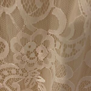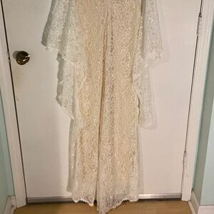 Absolutely beautiful vintage wedding gown in size small with flared, flowy sleeves, sheer neckline and intricate patterns and details. Straight out of a fairytale. Gently used, no visible signs of wear and tear except some stray threads but can be fixed right up.