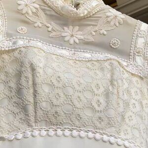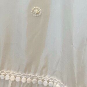 * Dainty embroidered or appliquéd flowers with pearls along neckline, upper back and scattered along body of dress and train.
