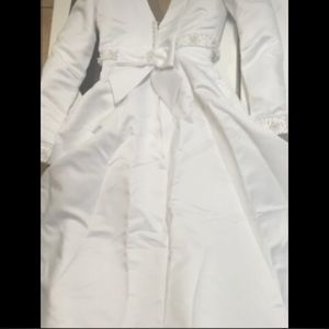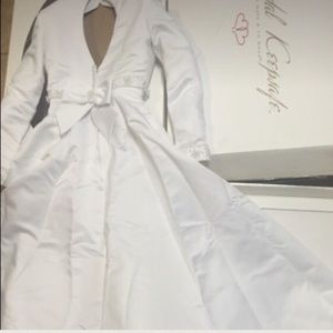Beautiful wedding dress purchased from Mon Amie bridal in Newport Beach for $1,500 . Empire waist & delicate Pearl accents around each wrist and under bust line. Extra toole skirt included to give lift. Original owner. Worn once. Very minor marks on lower portion of skirt hemline from the ground & small mark on chest area.Immediately after the wedding I had it professionally cleaned & it has been in preservation box ever since. Only opened for photos. This is a stunning vintage dress!