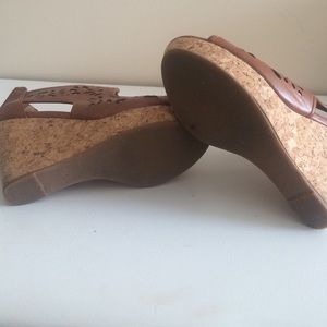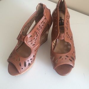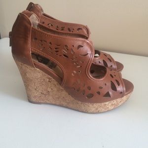 Crown Vintage "Kaysee" wedge. Cognac brown leather. About a 3.5 inch heel with a 1 in wedge up front. Very comfy although they probably wonder fit wide feet.
