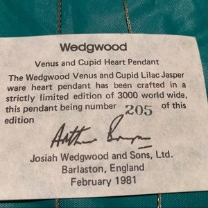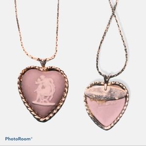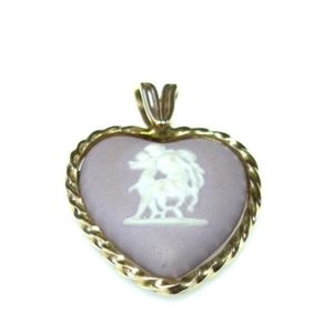 Vintage 14k Yellow Gold Wedgwood Lilac Heart Pendant This is a Unique, English Wedgwood Lilac Pendant is set into 14K Yellow Gold Frame Beautiful figure of Mother and Child Lilac Jasper is rare color and production was limited and intermittent Measures approx: 3/4" wide X 1" tall (with bail) or 2 cm X 2.5 cm Hallmarks: "Wedgwood Made in England" - possibly more writing under gold bar Stamp