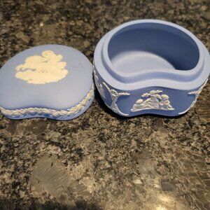 Vintage Wedgwood Blue Jasperware Trinket Box Heart Shaped Cherub Design 3"