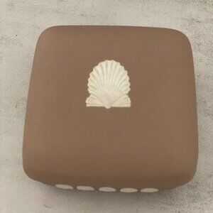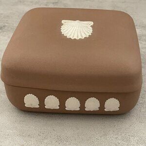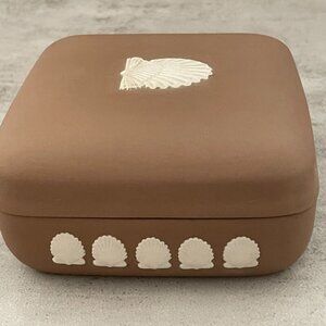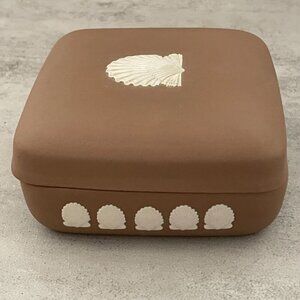 Vintage Wedgwood Brown Taupe Jasperware Cream Seashell 4" Square Covered Trinket Box Lidded