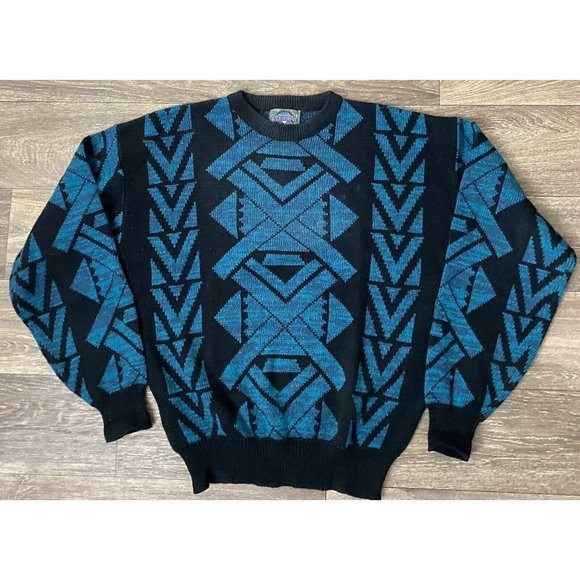 Vintage Weeds Knit Crewneck Sweater All Over Print Blue Black Mens XL Pullover. Used condition.