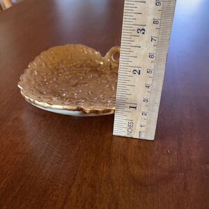 In perfect condition. Beautiful Gold Leaf Shaped dish. Bottom Stamped " Hand Decorated 22K Gold U.S.A. Weeping Bright Gold"