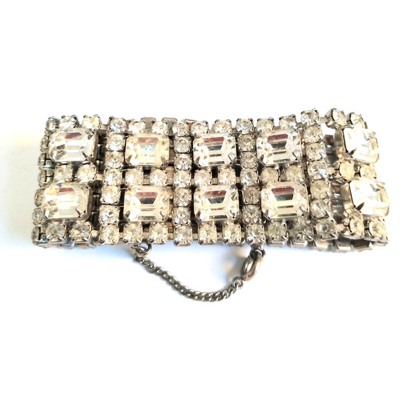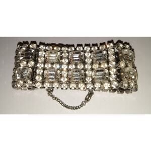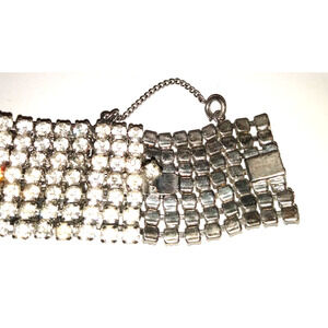 Vintage Weiss Clear Rhinestone 7 Row 60's Bracelet 7". 1.61" wide. Pre-owned in excellent condition. No stones missing. There is one "dead" stone that is black on back of bracelet (see photo).