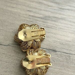 Weiss, clip on earrings, clip ons, vintage earrings, retro jewelry, statement earrings, clip on earrings, gold tone jewelry, blue stone earrings, woven design earrings, knot earrings, rhinestone earrings, classic style, mid century jewelry, timeless accessories, collectible jewelry, retro fashion, vintage style, gift idea, jewelry gift, holiday party earrings, wedding guest jewelry, anniversary gift, evening accessories, cocktail party earrings, special occasion jewelry, birthday gift, timeless gift, elegant earrings, bridal shower gift, date night jewelry, formal event accessories, classic gift idea