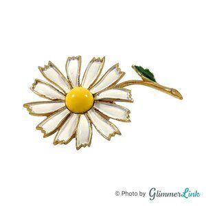 Vintage Weiss gold tone brooch featuring a large white enamel daisy with a yellow lucite center. It has a single green leaf on the stem.