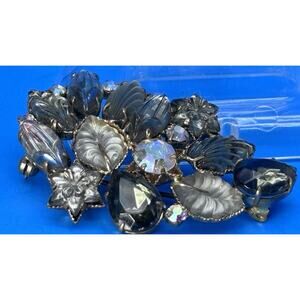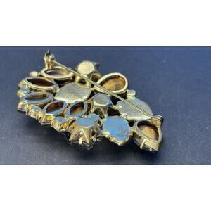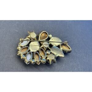 Vintage mid-century thermoset leaf brooch with AB rhinestones. circa 1955-65. Features molded thermoset leaves in clear and smoky tone accented with Aurora borealis rhinestones. Gold-tone, dimensional floral cluster design, unsigned attributed to Weiss based on construction material. Bright and sparkle, with secure safety clasp. Very good condition, no missing stones,