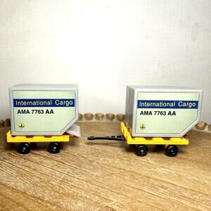 Vintage Welly die cast 6-piece international airport vehicle set featuring 2 cargo trailers and removable cargo crates, a jeep and tow tractors.
