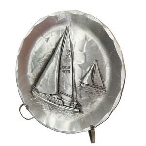 VINTAGE WENDELL AUGUST FORGE, HAMMERED ALUMINUM 4.5" W ART COASTER PLATE SAILBOATS BOATS OCEAN