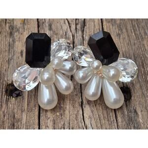 Vintage Wendy Gell Black Faux Pearl & Crystal Rhinestone Runway Clip On Earrings