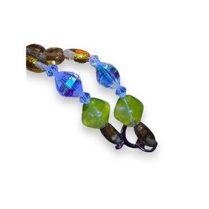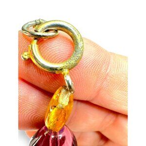 The two purple beads near the clasp glow green under a UV light indicating uranium or manganese and the orange crystal bead and orange crystals on the pendant also glow under UV light indicating the presence of cadmium.