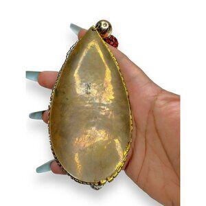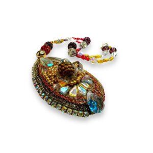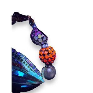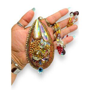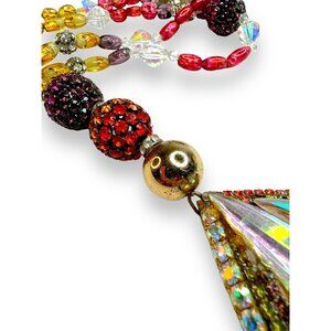 Truly unique: this necklace is one of one and handcrafted by artisan Wendy Gell. It is a large crystal, jewel, and rhinestone encrusted statement necklace. The pendant is 4 7/8" long and 2 5/8" at the widest part hanging from a 22" necklace that is Y shaped with the tail of the Y adding an additional 2 3/4". It is hand signed by Wendy Gell and dated 1982.