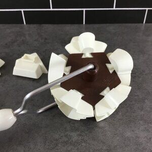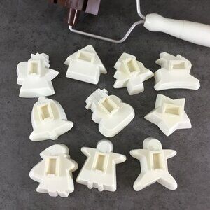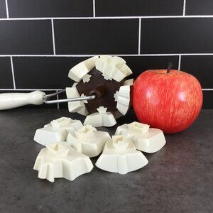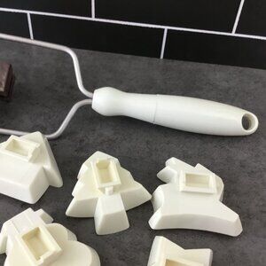 Charming vintage rolling cookie cutter wheel made in West Germany, circa early 1980s. his fun kitchen gadget features a brown mid-section with ten interchangeable white plastic cookie cutters and a white handle. Each cutter is marked with an arrow and letters A-G, I, J and one unmarked. for easy identification and assembly.