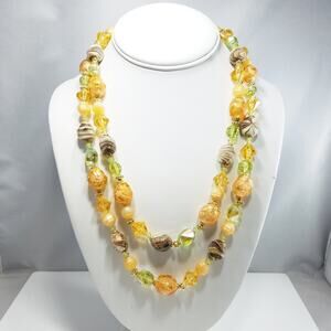 Vintage Western Germany Beaded Necklace Lucite Art Beads Yellow Gold Lime Cream Gold, Two Strands Decorative Box Clasp 1950s Vintage Jewelry