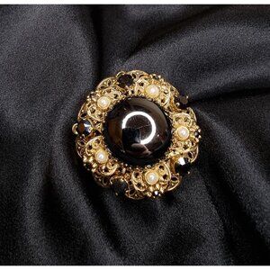 Accents: Alternating black faceted crystals and faux pearls form a decorative halo around the cabochon.