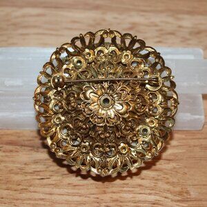 In good used condition. Some tarnishing. Pin on back reads "West Germany". Measures about 2.25" in diameter.