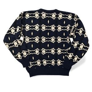 Color: Navy blue base with white and black geometric allover knit pattern.
