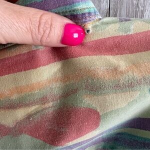 Cotton button down with a Western/Aztec theme. Pointing to flaws in photos (small hole on back neck, fabric imperfection, small spot and the stitching on the left underarm is coming undone but not a hole). Size is XL and measurements below. Pit to Pit 26” Length 32.5” UM5950