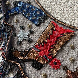 Features blue, red, silver, and brown sequins in cowboy boot + star motifs