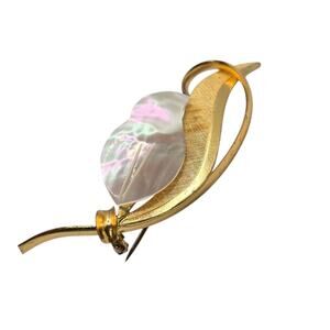 Vintage Western Germany Mother of Pearl Leaf Brooch Gold Tone Floral Pin MOP