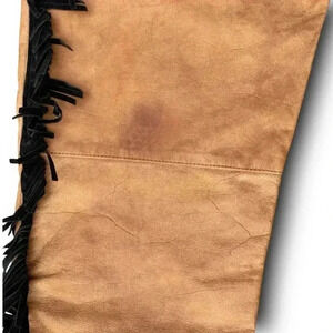 Flaw to be noted would be the left leg hem vent/split inner lining needs to be re-stitched as well as small areas where fringe meets leather, although still in wearable condition with minor stains, can be taken to a professional leather cleaner for further detailed cleaning; overall in great condition, these retro butter soft leather trousers have plenty of life left.