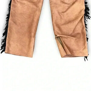 Vintage Western Brown Leather Pants Handmade Black Fringe 6P Straight Leg Chic