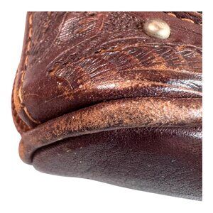Vintage Western Brown Tooled Leather Crossbody Bag Green Inlays & Stud Accents