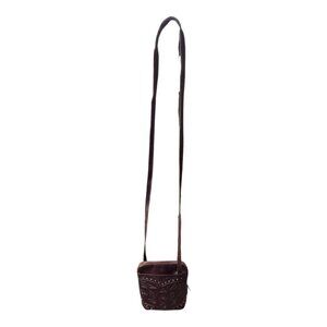 Elevate your accessory collection with this vintage Western crossbody bag. Crafted from durable leather, it features intricate tooled patterns and vibrant green inlays. The adjustable strap allows for comfortable wear, while the compact size is ideal for everyday essentials. Distinctive stud accents add a touch of rustic charm, making it a standout piece.