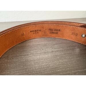 Authentic Western leather belt featuring silver-tone conchos and turquoise leather lacing. Made in Texas, USA from full grain cowhide. Classic cowboy/western rodeo style, size 42.