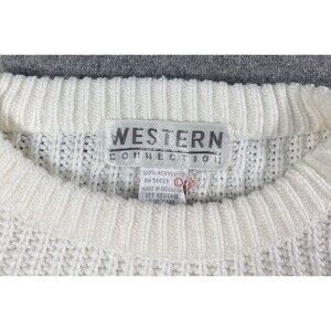 The Vintage Western Connection Women's Sweater in size L is a stylish and unique piece perfect for any wardrobe. Made of acrylic material, this sweater features intricate beading and a floral design, giving it a vintage flair. The white color adds a classic touch to the overall look, making it versatile for various outfits. With the Western Connection brand, you can expect high quality and attention to detail in this timeless piece of women's vintage clothing.