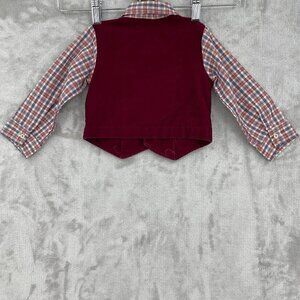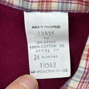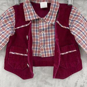 Vintage baby boy's long sleeve Western button front plaid shirt with faux corduroy vest detail. Arms of the shirt are woven cotton while the main body is thin wale corduroy in dark red. Size 24 Mos. Made in Phillipines. Please see photos for measurements.