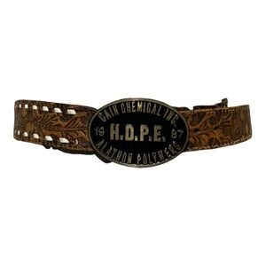 Stylish brown leather belt featuring a black buckle with embossed details. Perfect for adding a rugged touch to any outfit. Typical vintage condition with Nelda on the back of the belt. Vintage brass belt buckle with HOPE design in size 30”-32” waist.