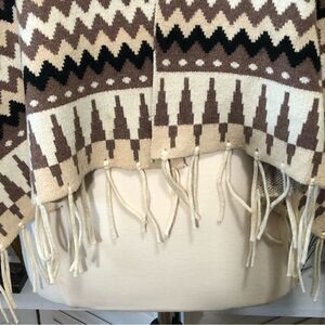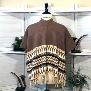 Vintage Western style poncho cape with zigzag fringe detail in a cream and brown wool blend.