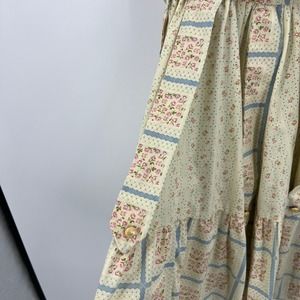 Vintage Western Fashions prairie style dress, calico floral, layered strips with faux button holes, short sleeve, zippered back, attached tie, flowing twirl skirt. Women's size 12.