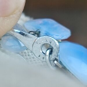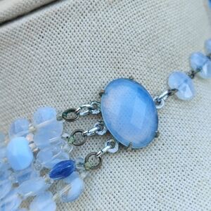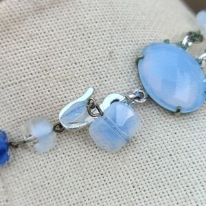 gorgeous amazing condition 15 to 18 in adjustable Western Germany silver tone and blue givre glass necklace with hook class and two beautiful faceted glass stones in the back. looks gorgeous when wearing hair up
