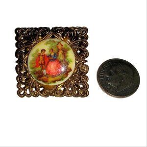 This charming Western Germany hand-painted porcelain brooch offers a delightful touch of history with its unique square shape. Featuring a romantic 18th Century couple image, this petite treasure measures just 1" by 1", making it a subtle yet eye-catching accessory. Authentically signed "Western Germany" on the safety clasp back, this well-preserved piece brings artistic heritage to your collection. Despite its small size, this brooch makes a remarkable impression with its exquisite craftsmanship and timeless appeal.