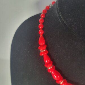 This vintage necklace features vibrant red glass beads and elegant gold-tone accents, embodying timeless sophistication and expert craftsmanship.
