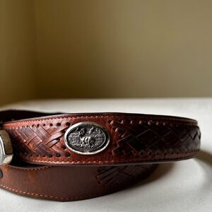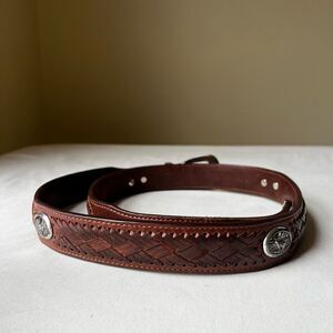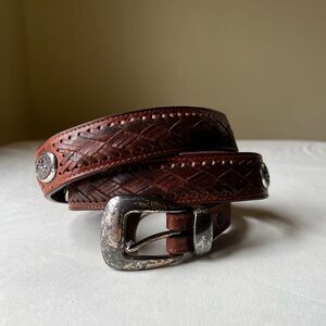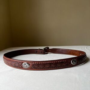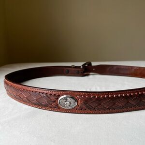 vintage western belt, brown leather cowboy belt, deer concho belt, 80s 90s rodeo style, country hunting belt, silver buckle belt, basket weave leather, Badger genuine leather westernwear