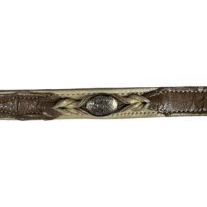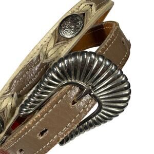 Vintage Western Leather Skinny Belt. Cream and taupe with silver tone concho hardware embellishments.