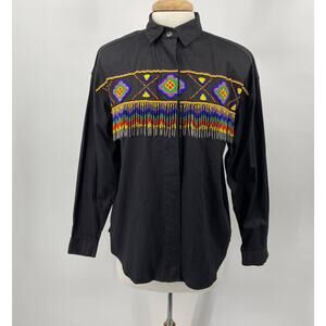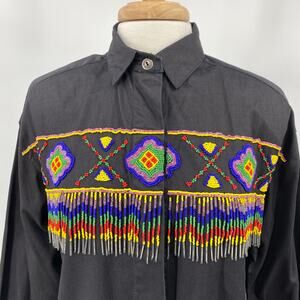 Vintage Western Shirt Cotton Button Down Front Beaded Fringe Black Womens Medium