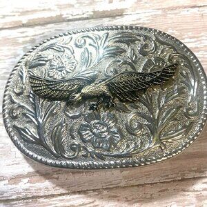 Once upon a time, in the heart of the Wild West, this belt buckle adorned the waist of a legendary cowboy. With an eagle soaring across a field of intricate floral patterns, it captured the spirit of freedom and adventure. Now, it waits for its next journey, ready to add a touch of history and charm to your attire.