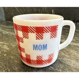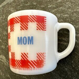 Vintage Westfield white milk glass with red white picnic plaid pattern and MOM in blue