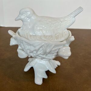 A unique Milk Glass piece, produced in the 1960s. The nest serves as the base and the bird the lid. There is beautiful detail on the bird and the nest, done in antique style. Please zoom in on photos. H 6.5in x W 6in x Depth 5in. Excellent condition, no chips or cracks. A rare decorative item!