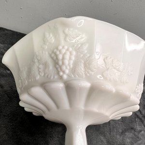 Vintage Westmoreland milk glass pedestal fruit bowl with grapevine design. Measures approx 6-3/4" tall x 8-1/4" across.