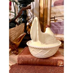 Vintage Westmoreland Mould Cream-Painted Milk Glass Large Hen on Nest – Red Acce